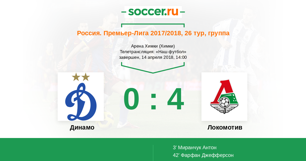 Доброго времени суток, уважаемые любители футбола! Сегодня в рамках двадцать шестого тура российской Премьер-Лиги состоится московское дерби, в гости к "Динамо" пожалует "Локомотив". "Железнодорожники" по-прежнему располагаются на первом месте в турнирной таблице, но отрыв от конкурентов сократился, московский "Спартак" дышит в спину "Локомотиву" на расстоянии двух очков. Подопечные Дмитрия Хохлова не проигрывают в чемпионате на протяжении шести матчей, "бело-голубые" набрали неплохой ход и готовы сегодня дать бой лидеру. В первом круге "Локомотив" уверенно выиграл у "Динамо", отправив в ворота "бело-голубых" три безответных мяча, голами в составе "железнодорожников" отметились Мануэл Фернандеш, Эдер и Алексей Миранчук. Посмотрим, смогут ли сегодня "бело-голубым" отобрать очки у лидера чемпионата?! Вместе с Вами следить за событиями этого увлекательного матча на soccer.ru будет Дмитрий Отмахов.