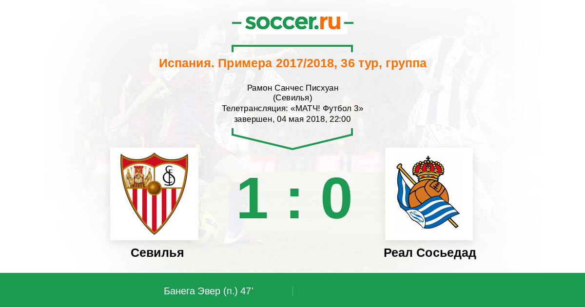 Не удалось команде Иманола Альгвасиля уйти от поражения, "Севилья" открыла счет в самом начале второго тайма, а затем "нервионцы" старались спокойно довести матч до победы! "Реал Сосьедад" значительно ухудшил свои шансы на попадание в еврокубки, а "Севилья" после сегодняшней победы поднимается на седьмую строчку в турнирной таблице. Комментировал для вас Дмитрий Отмахов. До новых встреч на soccer.ru.