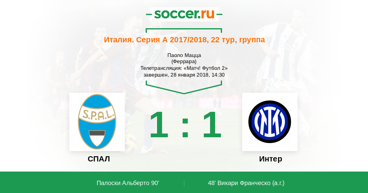 Все, прозвучал финальный свисток. Подопечные Леонардо Семпличи смогли вырвать ничью на заключительных минутах встречи. Обе команды продолжили свои безвыигрышные серии. У "Интера" ощутимые проблемы в игре, а СПАЛ дал настоящий бой. Спасибо, что следили за развитием событий поединка вместе с "Соккер.ру".