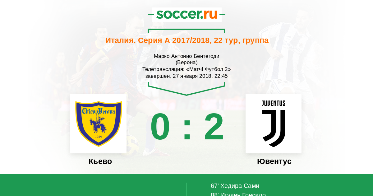 Доброго времени суток, уважаемые любители футбола! Рады приветствовать Вас на текстовой онлайн-трансляции поединка двадцать второго тура итальянской Серии А, в котором "Кьево" примет "Ювентус". Встреча пройдет в Вероне на стадионе "Марко Антонио Бентегоди", а рассудит команды бригада арбитров во главе с Фабио Мареской.