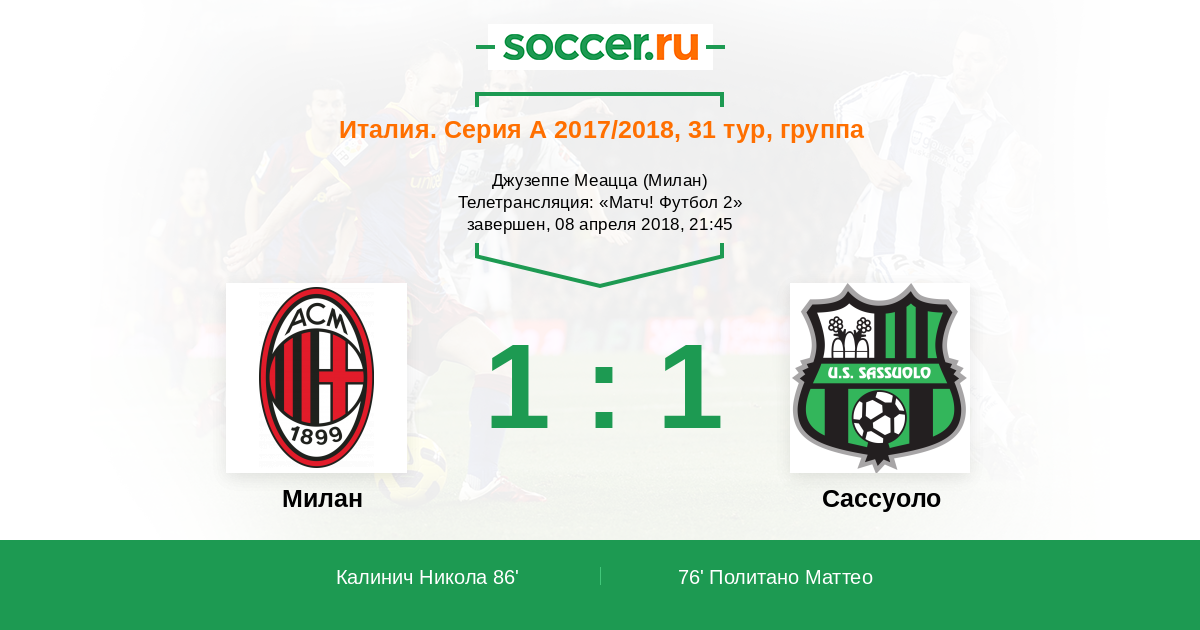 Доброго времени суток, уважаемые любители итальянского футбола! 31-ый тур Серии А заканчивается сегодня матчем на "Джузеппе Меацца", где местный "Милан", который совсем недавно подписал долгосрочный контракт с "красными дьяволами", примет "Сассуоло". И "Рома", и "Интер" довольно неожиданно по итогам уик-энда синхронно потерпели поражение от "Фиорентины" и "Торино" соответственно, и теперь у "россонери" есть замечательный шанс подтянуться к зоне Лиги Чемпионов, о которой еще пару месяцев назад тиффози "Милана" и мечтать не мечтали. На данный момент, в начале игрового дня, у подшефных Гаттузо после 30-и сыгранных матчей имеется 51 набранный балл: шестое место. В случае, если сегодня хозяева добьются победы, то отставание от "Интера", идущего на четвертой строчке, сократится до 5 очков. "Сассуоло", в свою очередь, располагается на 16-ой позиции, опережая "Кротоне" из зоны вылета (18-ое место) только лишь на 5 баллов. Как Вы уже успели понять, очки кровь из носу нужны и тем, и другим для достижения своих целей, а потому борьба на поле предстоит нешуточная. Стартовый свисток прозвучит в 21:45 по московскому времени. Оставайтесь на "Соккер.ру"!