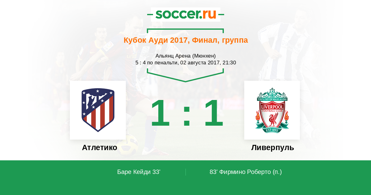 Доброго времени суток, уважаемые любители футбола! "Соккер.ру" рады приветствовать Вас на текстовой онлайн-трансляции финального поединка "Audi Cup", в котором сразятся "Атлетико Мадрид" и "Ливерпуль". Только вчера утихли полуфинальные баталии, которые, несмотря на товарищеский статус турнира, подарили зрителям отличный футбол, накал страстей и зрелище.