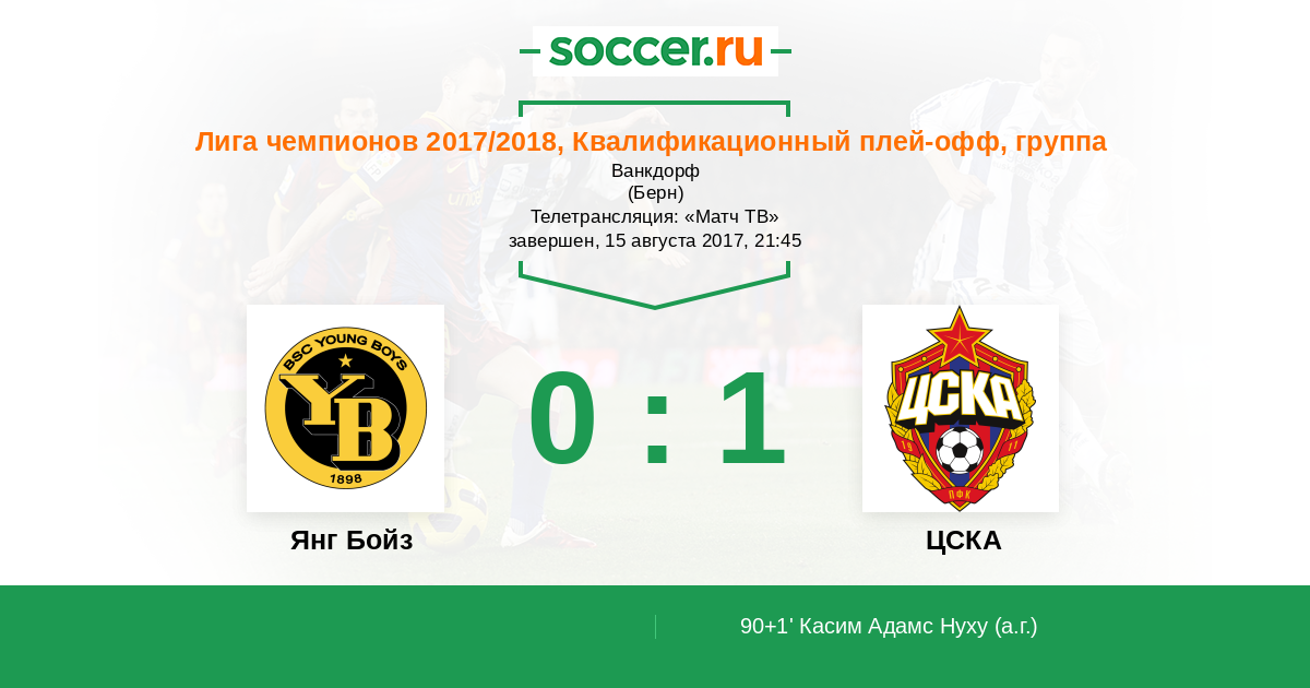 Все! Матч завершен! ЦСКА одержал важную выездную викторию над "Янг Бойз" со счетом 1:0, гол в свои ворота забил Касим Нуху в компенсированное арбитром время. "Пчелы" больше владели инициативой, создали немало опасных моментов у ворот "армейцев", но надежно сыграла оборона ЦСКА. А благодаря ошибке Нуху "красно-синие" одержали важную победу перед ответной игрой. Предлагаем Вам выбрать лучших игроков этого матча в составах обеих команд. Для Вас прямую онлайн-трансляцию этого поединка провел Андрей Бабенчук. Оставайтесь на http://www.soccer.ru/!