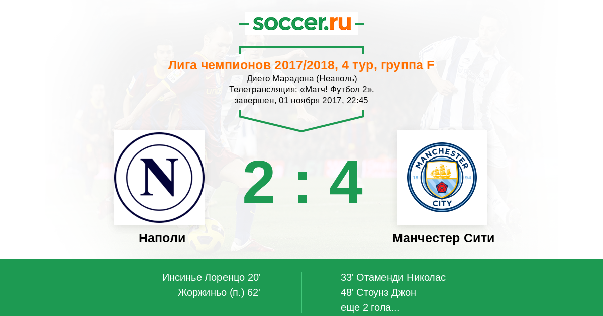 Добрый вечер, уважаемые поклонники Лиги чемпионов! В одном из центральных матчей 4-го тура группового этапа итальянский "Наполи" в родных стенах сыграет против английского "Манчестер Сити". Если в гостях в матче двухнедельной давности неаполитанцы могли позволить себе проиграть, то дома обязательно нужно брать очки, иначе они окажутся на грани не попадания в плей-офф ЛЧ. Чей футбол окажется сильнее? Сайт http://www.soccer.ru проведёт прямую текстовую онлайн трансляцию матча, следить за событиями на поле "Сан-Паоло" и комментировать игру для вас будет Старчеус Сергей.