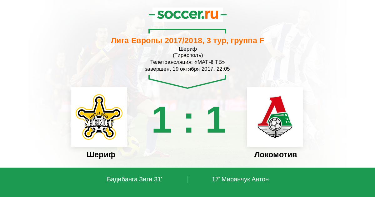 Доброго времени суток, уважаемые любители футбола! Сегодня в рамках третьего тура группового этапа Лиги Европы в гости к тираспольскому "Шерифу" пожалует московский "Локомотив". На данный момент "железнодорожники" возглавляют группы F, имея в активе четыре очка. Молдавский "Шериф" и датский "Копенгаген" делят вторую строчку, обе команды идут без забитых и без пропущенных мячей, имея в активе по два балла. Замыкает квартет под литерой F чешский "Фастав", в активе которого числится одно очко. Ранее пути "Шерифа" и "Локомотива" в еврокубках не пересекались. Команда Юрия Семина считается фаворитом в сегодняшней встрече, сможет ли "Локомотив" добыть важные три очка на выезде?! Вместе с Вами следить за событиями этого матча на soccer.ru будет Дмитрий Отмахов.