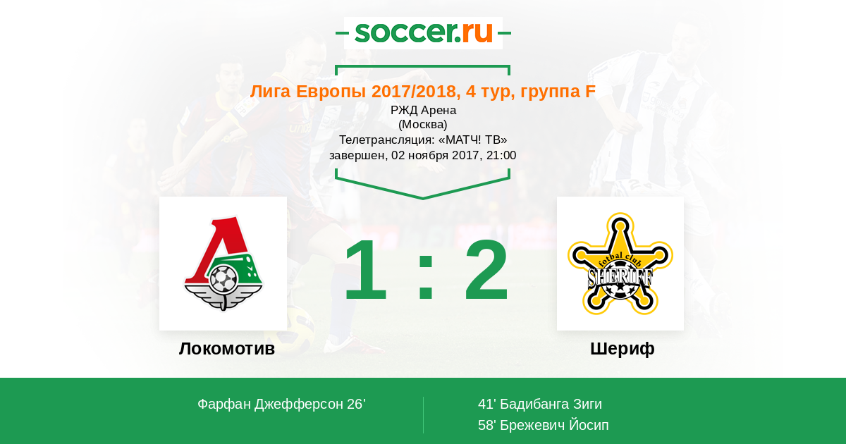 Доброго времени суток, уважаемые любители футбола! Сегодня в рамках четвертого тура группового этапа Лиги Европы в гости к московскому "Локомотиву" пожалует молдавский "Шериф". В прошлом туре команды в Тирасполе разошлись миром со счетом 1:1, на гол Антона Миранчука, "осы" ответили голом Зигуя Бадибанги. После трех туров квартет под литерой F возглавляет "Локомотив", который на данный момент является единственной командой одержавшей победу в группе. У "железнодорожников" в активе пять очков, по три у "Шерифа" и датского "Копенгагена", и два балла набрал чешский "Фастав". В случае победы в сегодняшнем матче подопечные Юрия Семина значительно приблизятся к выходу в следующую стадию турнира. Вместе с Вами следить за событиями этого матча на soccer.ru будет Дмитрий Отмахов.