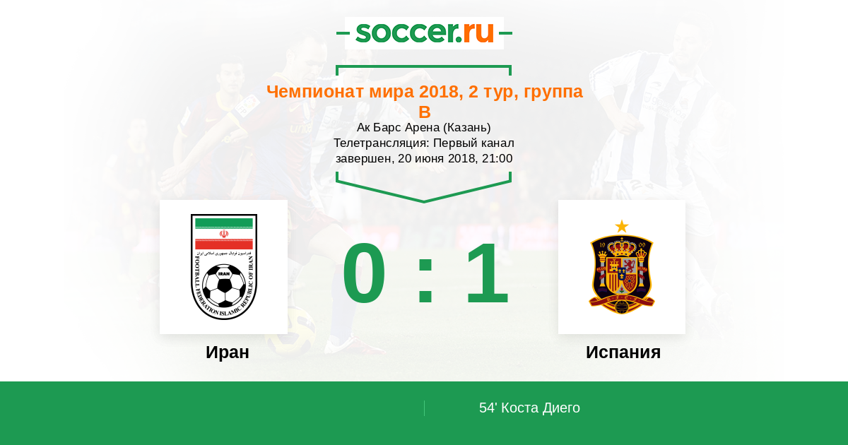 Все! Матч завершен! Сборная Испании в тяжелом поединке обыграла сборную Ирана с минимальным счетом 1:0 благодаря голу Диего Косты. Для Вас прямую онлайн-трансляцию этого поединка провел Андрей Бабенчук. Оставайтесь на https://www.soccer.ru/