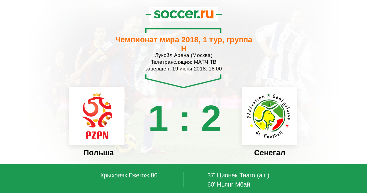 Доброго времени суток, уважаемые любители футбола! Рады приветствовать Вас на текстовой онлайн-трансляции поединка первого тура чемпионата мира, в котором сборная Польши встретится со сборной Сенегала. Встреча пройдет в Москве на стадионе "Открытие Арена".