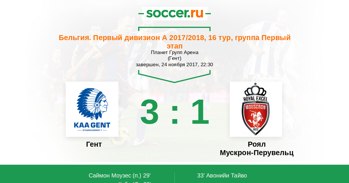 Гент - Роял Мускрон-Перувельц: обзор матча 24 ноября 2017