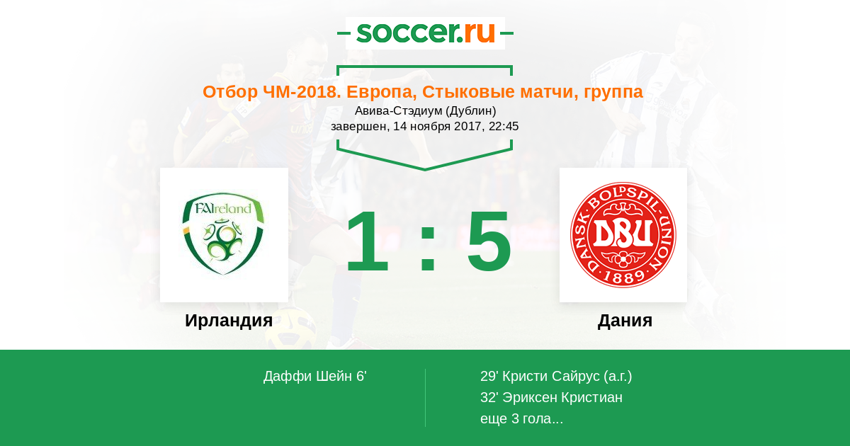 Доброго времени суток, уважаемые любители футбола! Рады приветствовать Вас на текстовой онлайн-трансляции ответного стыкового матча между сборной Ирландии и сборной Дании. Встреча состоится на "Авива-Стэдиум" в городе Дублин, а рассудит соперников польская бригада арбитров во главе с Шимоном Марциняком.