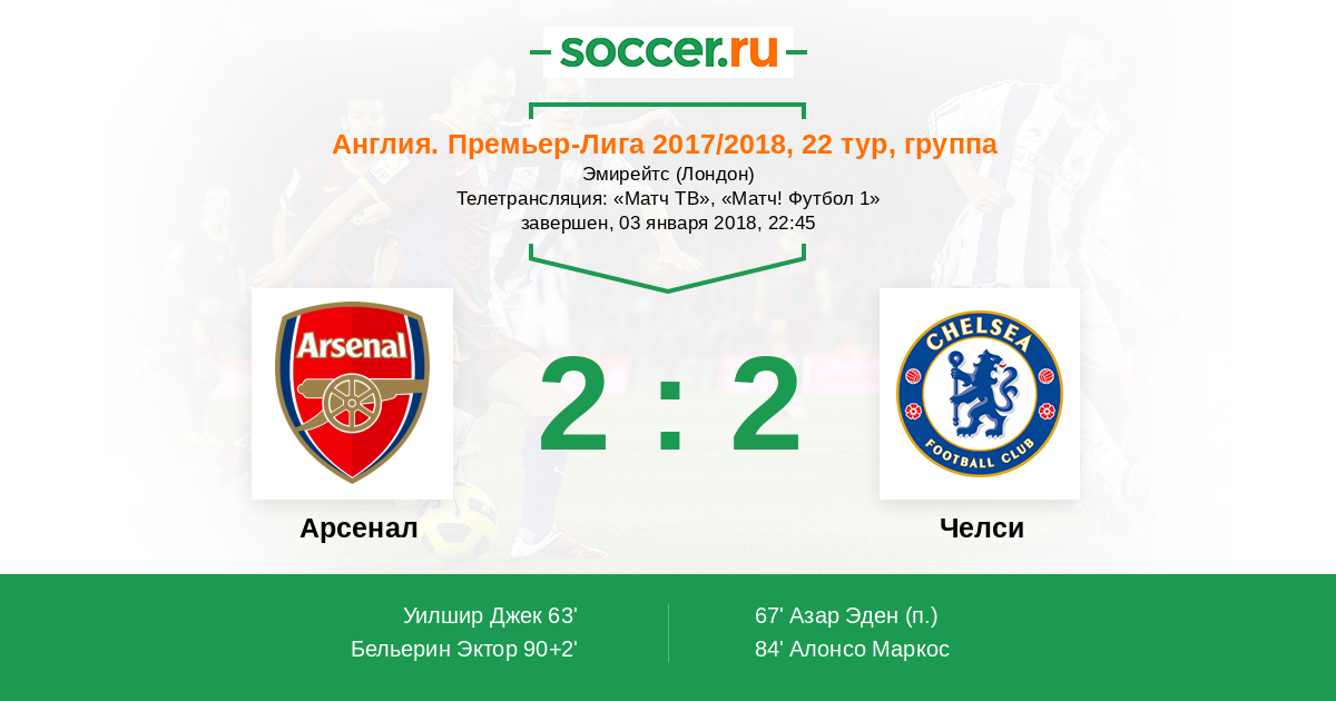 Все! Матч завершен! "Арсенал" и "Челси" расписали боевую ничью на "Эмирейтс" со счетом 2:2! "Канониры" открыли счет в начале второй половины матча, однако "аристократы" сразу же сравняли усилиями Азара. Уже в конце встречи Маркос Алонсо, казалось, подарил "синим" викторию, однако мощный удар Эктора Бельерина установил окончательный счет на табло - ничья 2:2. Для Вас прямую онлайн-трансляцию этого поединка провел Андрей Бабенчук. Оставайтесь на http://www.soccer.ru/!