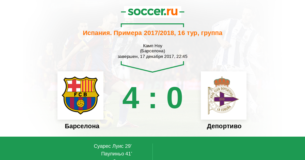 Доброго времени суток, уважаемые любители футбола! Рады приветствовать Вас на текстовой онлайн-трансляции поединка шестнадцатого тура испанской Примеры, в котором "Барселона" примет "Депортиво". Встреча пройдет на стадионе "Камп Ноу", а рассудит команды бригада арбитров во главе с Матеу Лаосом.