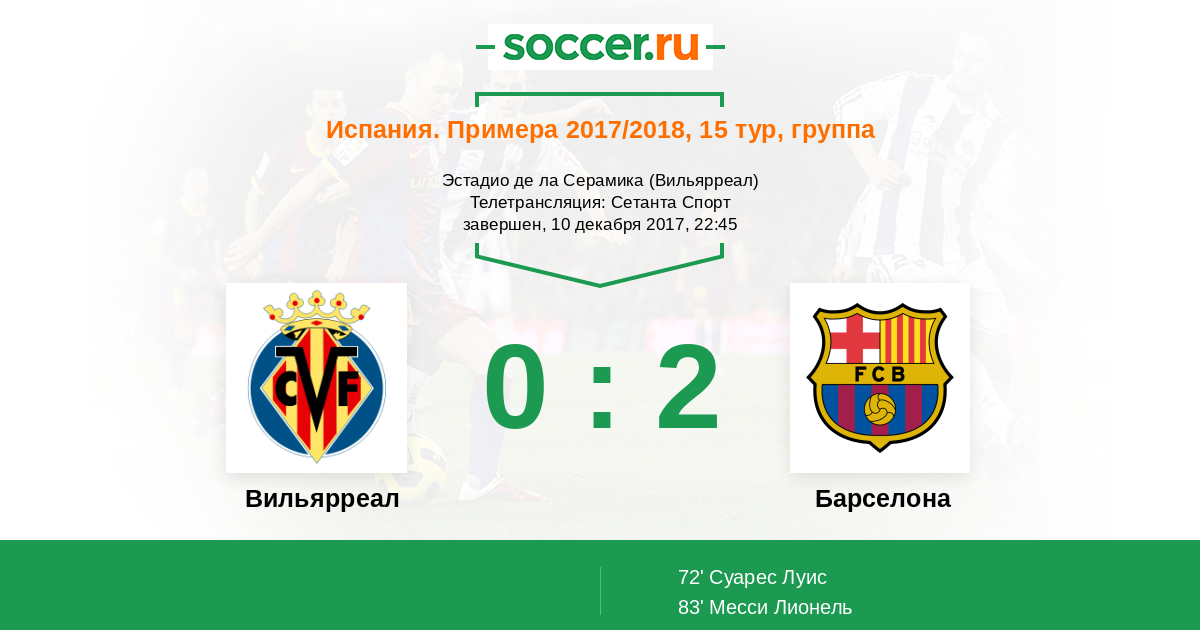 Приветствуем всех любителей европейского футбола! Мы с вами отправляемся на «Эстадио де ла Серамика», чтобы посмотреть за противостоянием «Вильярреала» и «Барселоны». Сможет ли команда Хавьера Кальехи отобрать очки у лидера Примеры в домашних стенах? Узнаем совсем скоро! Обслуживать данную встречу будет Рикардо Бенгоэчеа. Начинаем в 22:45 по Москве.