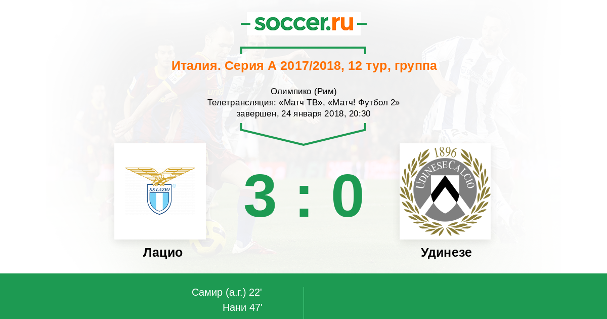 Все! Матч завершен! "Лацио" одержал уверенную домашнюю викторию над "Удинезе" в перенесенном матче 12-го тура со счетом 3:0. Забивали в составе "Лацио" Нани и Фелипе Андерсон, еще автоголом отметился Самир. Для Вас прямую онлайн-трансляцию этого поединка провел Андрей Бабенчук. Оставайтесь на https://www.soccer.ru/!