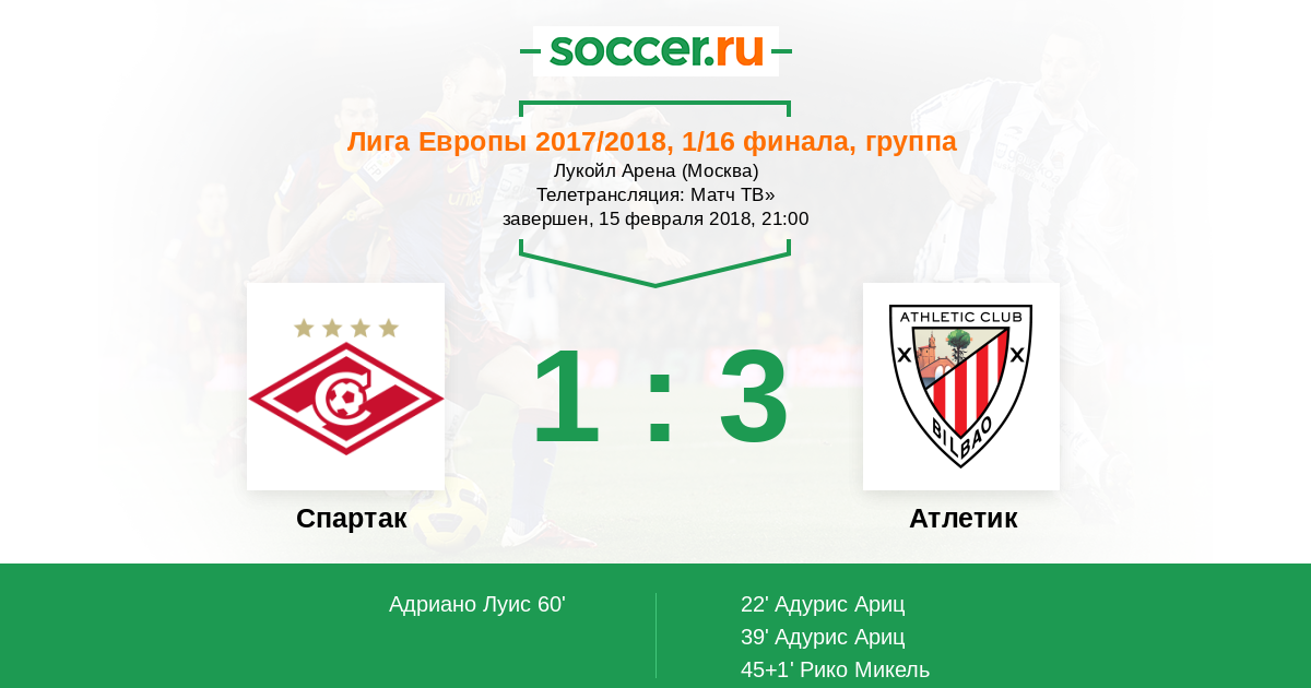 Добрый вечер всем любителям футбола! Рады приветствовать Вас на первом матче 1/16 финала Лиги Европы, в котором на стадионе "Открытие Арена" в Москве сыграют "Спартак" и "Атлетик" Бильбао. Для Вас прямую текстовую онлайн-трансляцию этого поединка проведет Андрей Бабенчук.