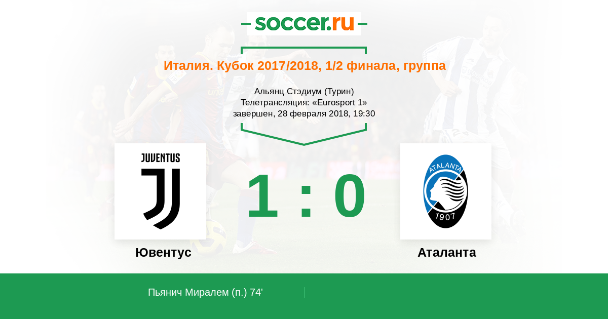 "Юве" дважды обыграл "Аталанту" с минимальным счетом, таким образом оставив команду Гасперини за бортом Кубка Италии, а сами же "бьянконери" идут за своим 13-ым по счету трофеем в этом турнире. Сегодня поздним вечером "Милан" и "Лацио" разыграют вторую путевку в финал, следите за ответной встречей между "дьяволами" и "орлами" на "Соккер.ру"! Всего доброго!