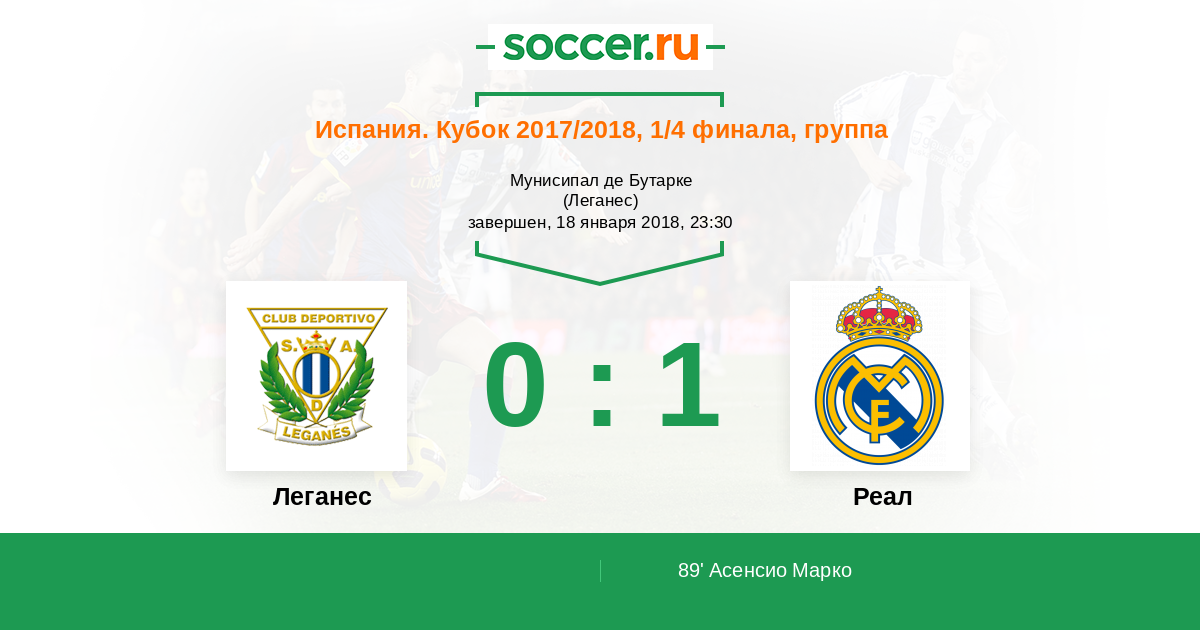 Доброго времени суток, уважаемые любители футбола! Рады приветствовать Вас на текстовой онлайн-трансляции первого четвертьфинального поединка между "Леганесом" и "Реалом" в рамках Кубка Испании. Встреча пройдет в Леганесе на стадионе "Мунисипал де Бутарке".