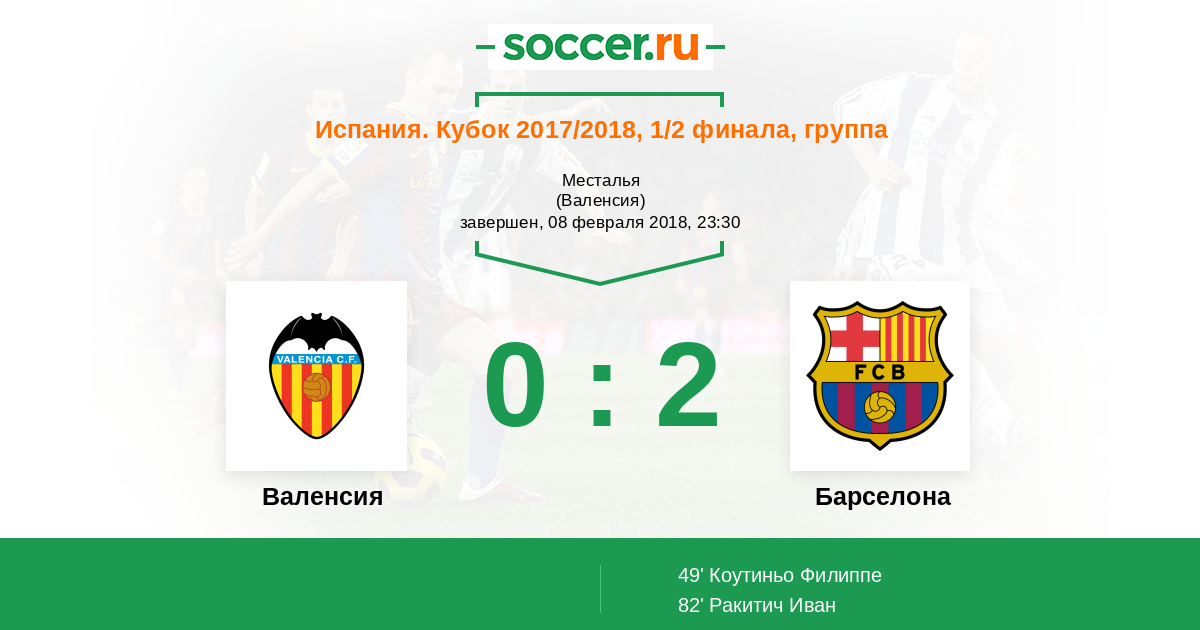 Поединок завершен. "Валенсия" снова не смогла поразить ворота "Барселоны", пропустив при этом дважды. Каталонцы отправляются в финал, где сыграют против "Севильи". Надеемся, что там мы увидим нечто похожее на тот футбол, который показали команды в Суперкубке Европы в Тбилиси.