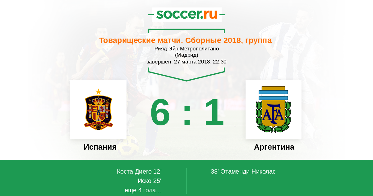 Классный матч выдали сборные в Мадриде. Хоть Аргентина и потерпела крупное поражение, но выглядела весьма достойно, много атаковала и создавала моменты. Заметно было, что не хватало Аргентине креативности в атаке в лице Месси, но от зависимости одного конкретного игрока надо избавляться. Испания в полном порядке, команда сыграла превосходно. Прямую текстовую онлайн трансляцию матча для вас провёл Старчеус Сергей. Занимайтесь спортом, любите футбол и до новых встреч на https://www.soccer.ru !