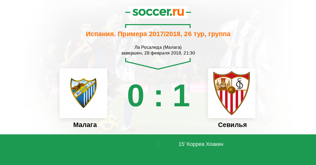 Пабло Сарабия (Севилья) убежал в сольный проход, но не смог создать опасный момент - защитники в итоге хорошо сыграли. Мяч покинул пределы поля. Малага введет мяч в игру ударом от ворот.