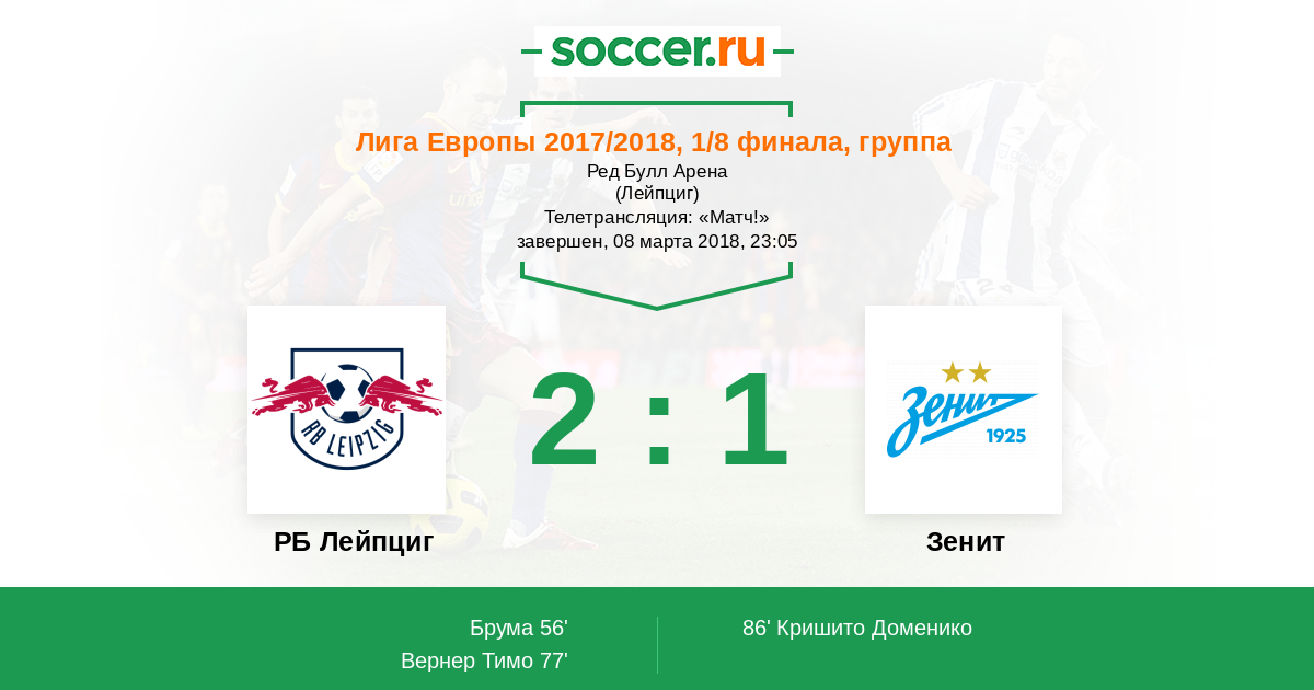 Все. 2:1. Сине-бело-голубые уступают в Лейпциге. Ответный матч 1/8 финала — уже через неделю на стадионе «Санкт-Петербург».#РБЛейпцигЗенитpic.twitter.com/pdDBkToffC