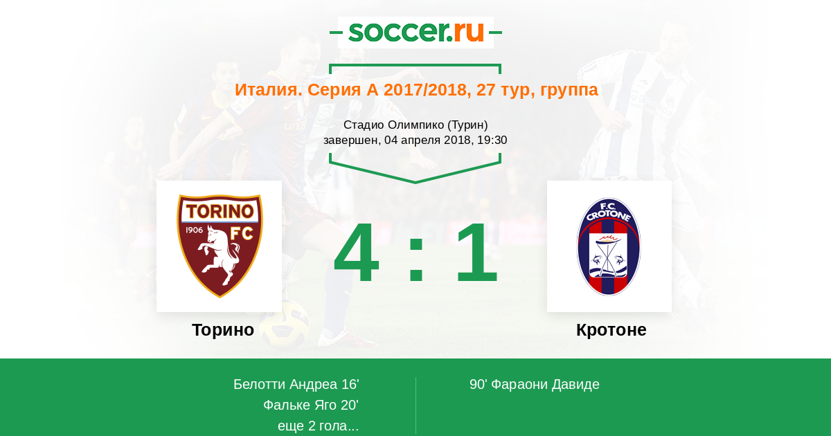 Марко Тумминелло отравил отличный навес в штрафную. Марко Фараони (Кротон) получил мяч и вогнал его в сетку. Голкипер был неспособен обить мяч, пущенный в правый угол ворот. Счет теперь 4:1.