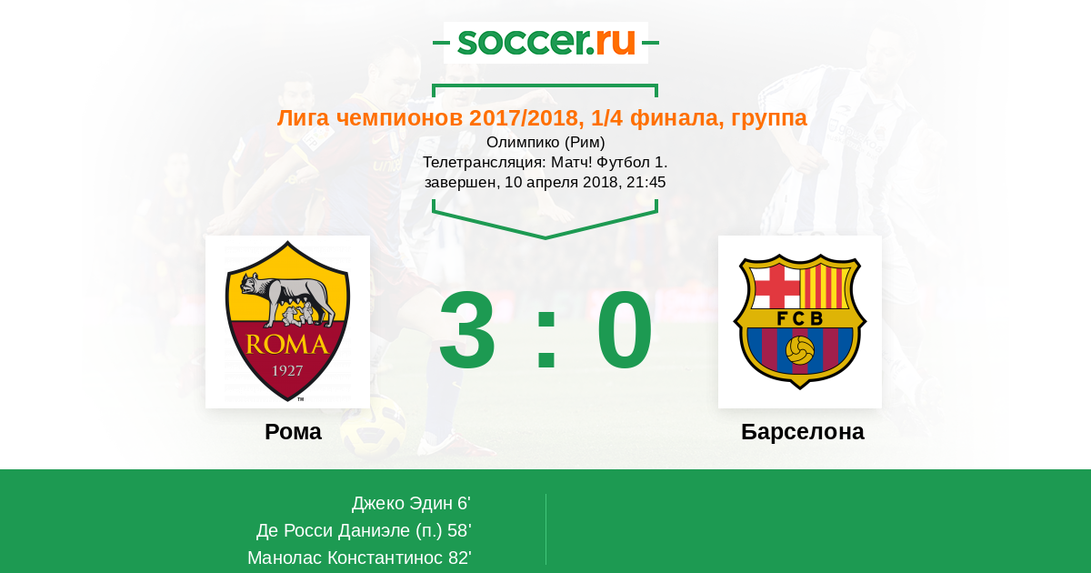 Добрый вечер, уважаемые поклонники лиги чемпионов! "Рома" потерпела крупное поражение на "Камп Ноу" и сегодня попытается сотворить чудо, обыграв "Барселону" в ответной встрече. Практически не осталось шансов на продолжение борьбы у хозяев поля, однако в родных стенах они постараются дать бой своему более квалифицированному сопернику. Удастся ли римлянам обыграть каталонский клуб на "Олимпико"? Сайт https://www.soccer.ru проведёт прямую текстовую онлайн трансляцию матча, следить за событиями на поле и комментировать игру для вас будет Старчеус Сергей.