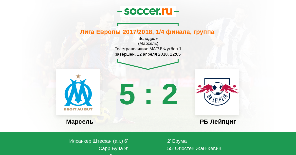 Это было потрясающее зрелище! "Марсель" при сумасшедшей поддержке трибун разгромил "РБ Лейпциг" и вышел в полуфинал турнира. На двоих команды сегодня забили семь голов, а главным героем встречи стал Димитри Пайет, отметившийся точным ударом и голевой передачей - настоящий капитан. Жеребьевка полуфинальных противостояний состоится уже завтра. Текстовую онлайн-трансляцию провел Глеб Васильев. Всем пока!