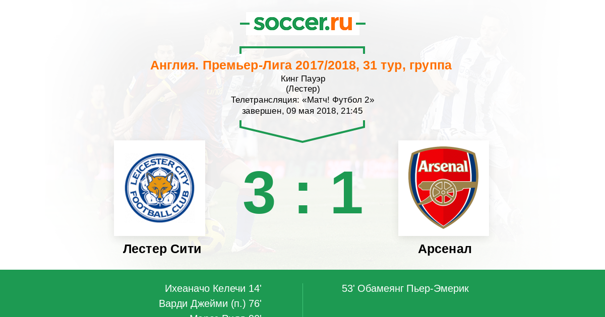 Добрый вечер всем любителям футбола! Рады приветствовать Вас на матче 31-го тура английской Премьер-лиги, в котором на стадионе "Кинг Пауэр" сыграют "Лестер" и лондонский "Арсенал". Для Вас прямую текстовую онлайн-трансляцию этого поединка проведет Андрей Бабенчук.