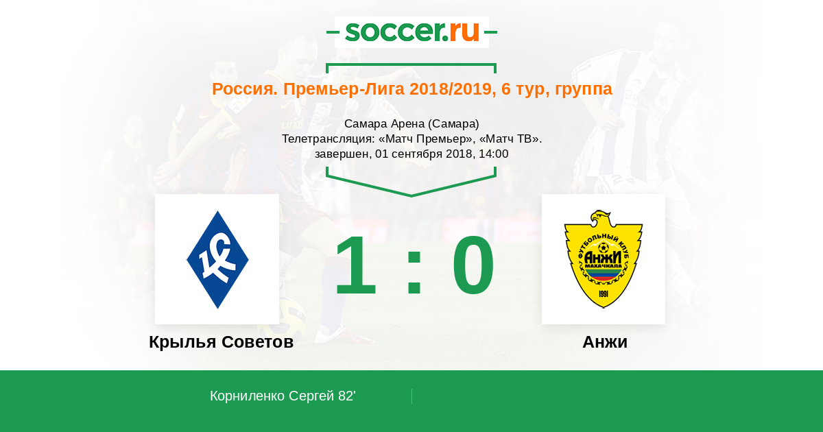 Добрый день, уважаемые любители российского футбола! Сегодня будет сыграно три матча в 6-м туре РПЛ, открывать программу будут самарские "Крылья Советов" и махачкалинский "Анжи". Хозяева считаются фаворитами встречи, хотя у самарцев достаточно много игровых проблем, которые сказываются на результатах. Но у "Анжи" их ещё больше, в первую очередь, дело в финансовой стороне, очень сложно настроить себя играть на максимуме, когда нет уверенности в завтрашнем дне. "Крылья Советов" провалились в зону вылета, но могут её покинуть уже в этом туре, если обыграют дома "Анжи". Сайт https://www.soccer.ru проведёт прямую текстовую онлайн трансляцию матча, следить за событиями на поле и комментировать игру для вас будет Старчеус Сергей.
