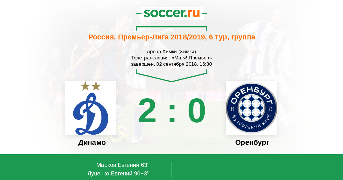 Доброго времени суток, уважаемые любители футбола! Рады приветствовать Вас на текстовой онлайн-трансляции матча шестого тура РПЛ, в котором "Динамо" сыграет с "Оренбургом". Встреча пройдет в Химках на стадионе "Арена-Химки". Обслужит матч бригада арбитров во главе с Сергеем Лапочкиным.