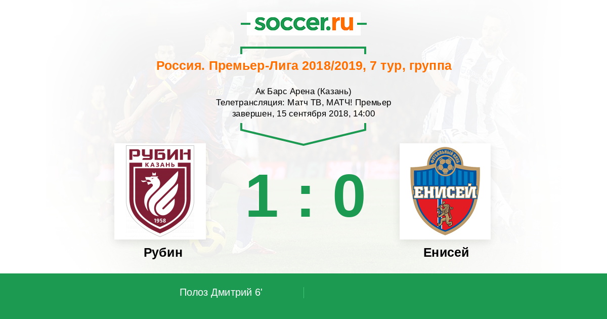 Вот и всё! "Рубин" забил гол в начале игры, после чего большую часть времени оборонялся, доведя матч до победного исхода. "Енисей" бился до последней секунды, однако Иван Коновалов сохранил свои ворота в неприкосновенности. Текстовую онлайн-трансляцию провёл Глеб Васильев. Всем пока!