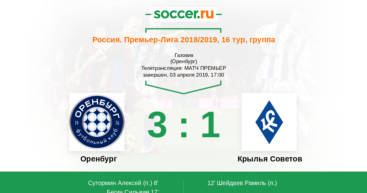 Добрый день всем любителям футбола! Рады приветствовать Вас на матче 16-го тура российской Премьер-лиги, в котором на стадионе "Газовик" сыграют "Оренбург" и "Крылья Советов".