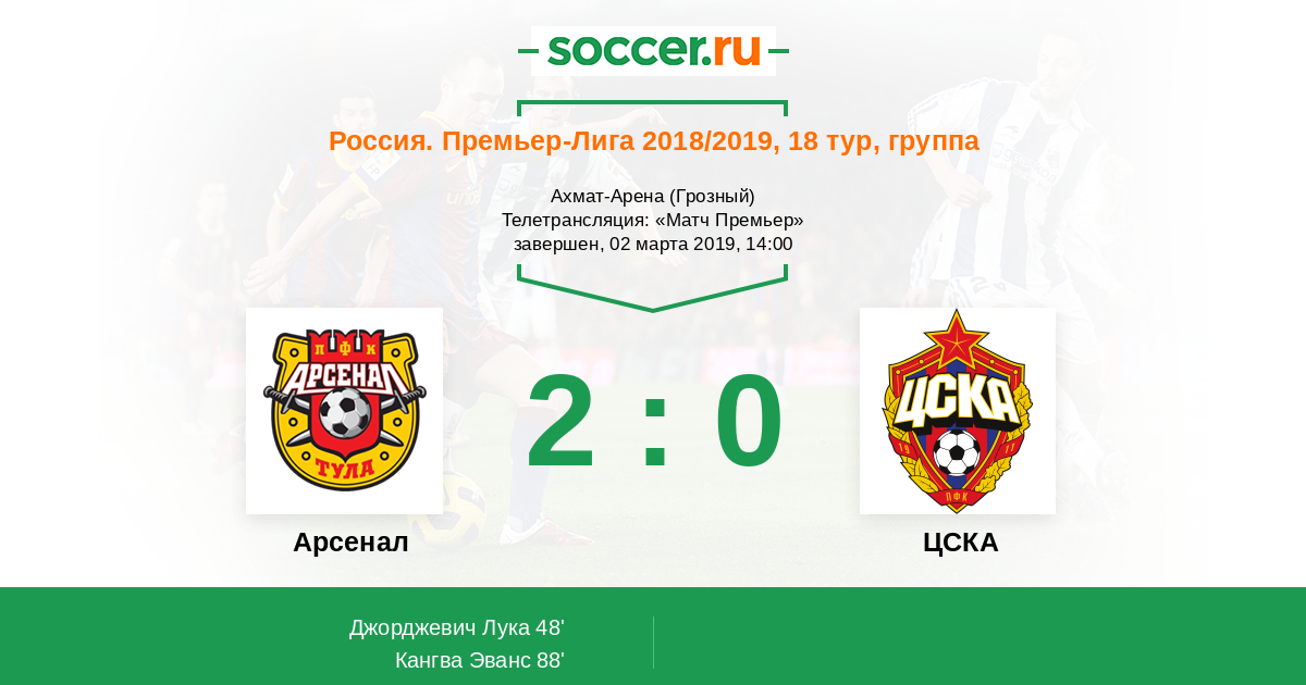 Добрый день всем любителям футбола! Рады приветствовать Вас на матче 18-го тура российской Премьер-лиги, в котором на стадионе "Ахмат-Арена" в Грозном сыграют тульский "Арсенал" и ЦСКА.