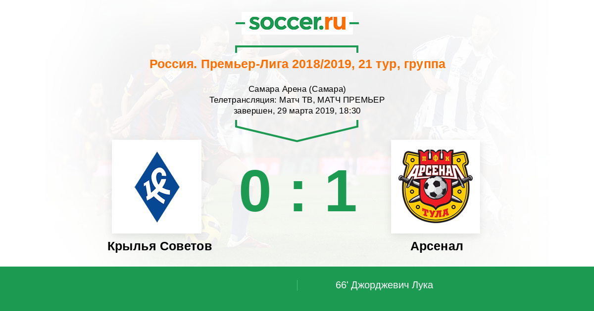 В стартовом матче 21-го тура РПЛ тульский "Арсенал" обыгрывает самарские "Крылья Советов", отрывается от них на 6 очков и на время вплотную приближается в турнирной таблице к московскому "Спартаку". Следите за футболом на "Соккер.ру"! Всего доброго!