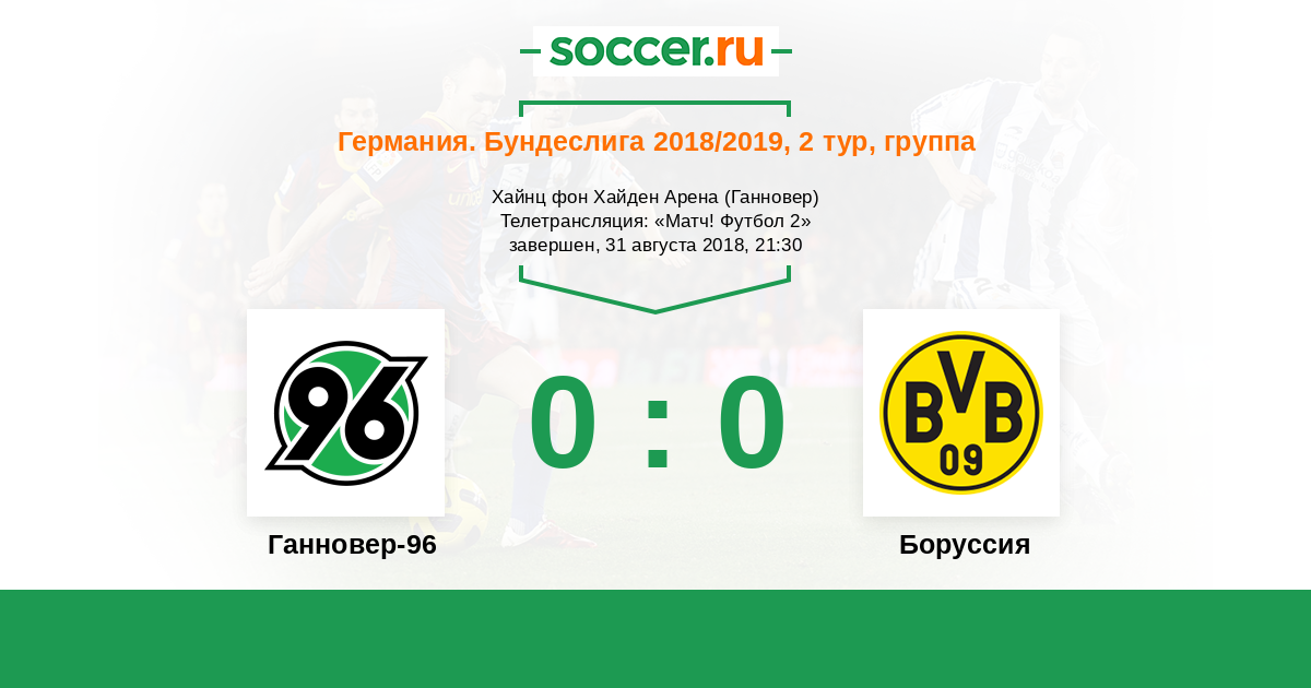 Все! Матч завершен! "Ганновер" и дортмундская "Боруссия" расписали "сухую" ничью, поделив очки. Для Вас прямую онлайн-трансляцию этого поединка провел Андрей Бабенчук. Оставайтесь на https://www.soccer.ru/!