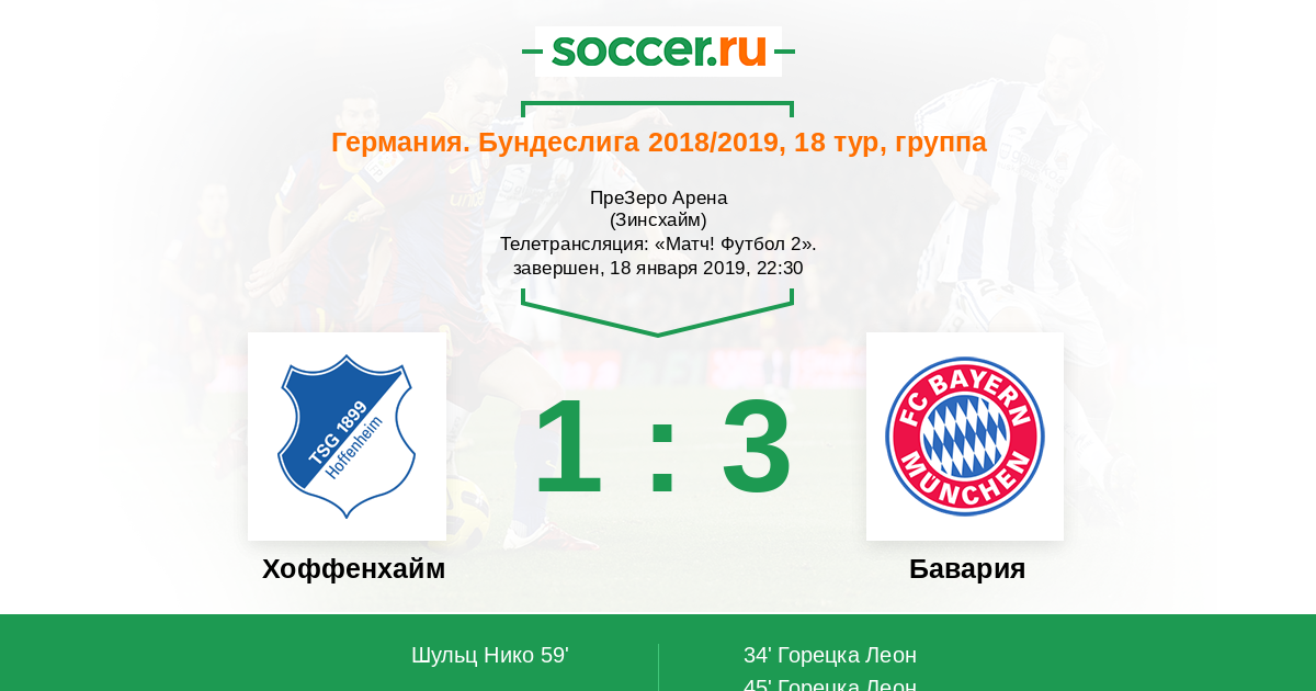 "Бавария" хорошо подготовилась к второй части сезона и начала свой путь с победы. Отставание от дортмундской "Боруссии" сократилось до трёх пунктов, но "шмели" свой матч ещё сыграют. "Хоффенхайм" не может победить в чемпионате аж с начала ноября прошлого года, команда попала в кризис. Отличный матч, классные голы мы увидели. Прямую текстовую онлайн трансляцию матча для вас провёл Старчеус Сергей, до новых встреч на https://www.soccer.ru !