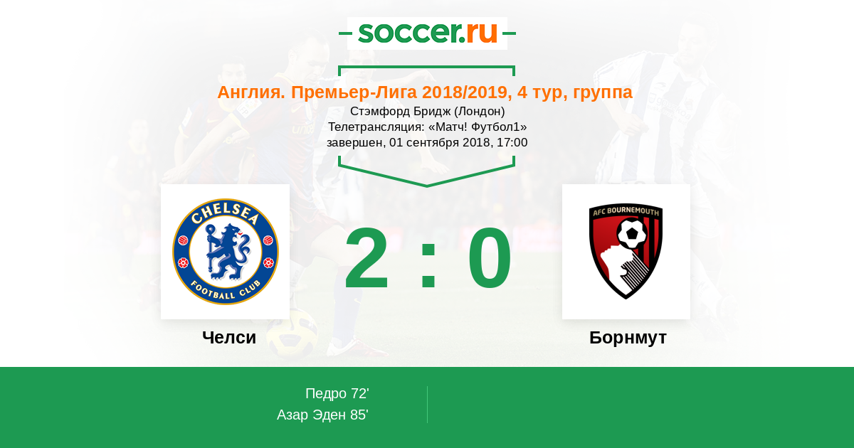 "Пенсионеры" являются одной из четырех команд, которые пока что идут без потерь. Маурицио Сарри вряд ли может сказать, что "синие" играют так, как он хочет, но результат есть. Эден Азар вернулся в основной состав и уже набрал кондиции, чтобы проводить весь матч. Впрочем, "Борнмут" весьма неприятный соперник, поэтому расслабляться не стоит.