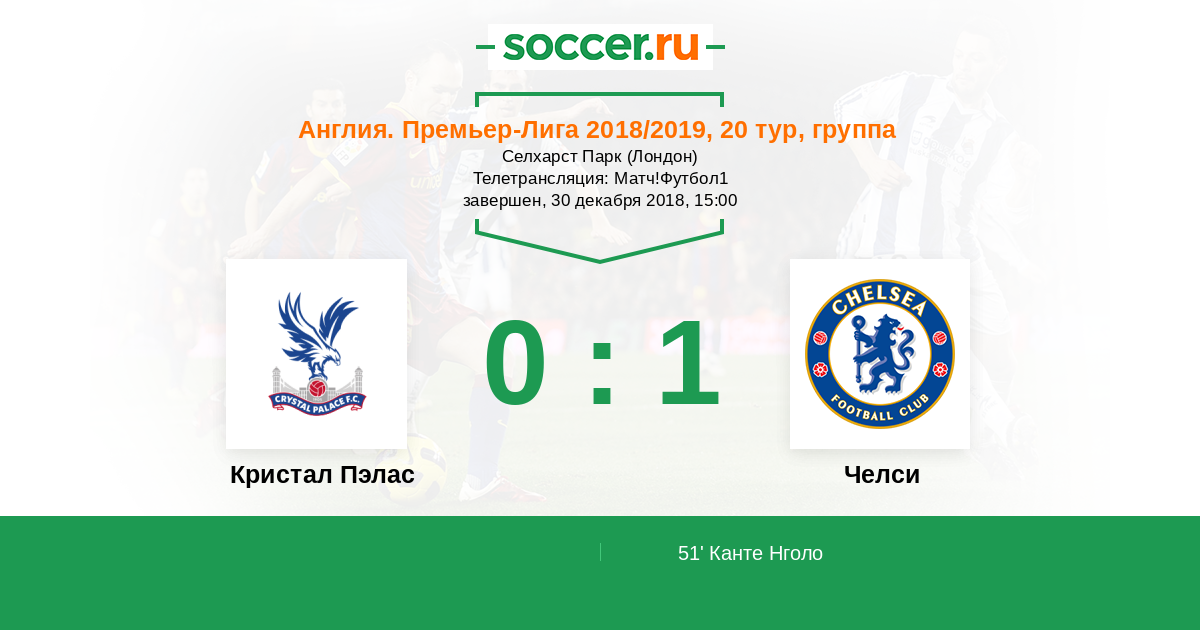 Доброго времени суток, уважаемые любители футбола! Рады приветствовать Вас на текстовой онлайн-трансляции матча двадцатого тура АПЛ, в котором "Кристал Пэлас" сыграет с "Челси". Встреча пройдет в Лондоне на стадионе "Селхарст Парк". Обслужит матч бригада арбитров во главе с Крейгом Поусоном.