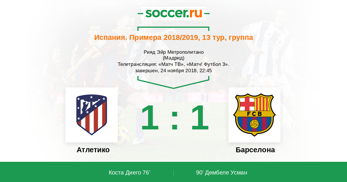 Добрый вечер, уважаемые поклонники испанского футбола! В центральном поединке 13-го тура Ла Лиги "Барселона" постарается заработать очки на поле "Атлетико", частенько огорчающего каталонцев. Ярко выраженного лидера в нынешнем сезоне в Примере нет. Претенденты на чемпионство стабильностью выступлений похвастаться не могут. Результат предстоящего поединка может существенно повлиять на расстановку команд, борющихся за высокие места. Сайт https://www.soccer.ru проведёт прямую текстовую онлайн трансляцию матча, следить за событиями на поле и комментировать игру для вас будет Старчеус Сергей.