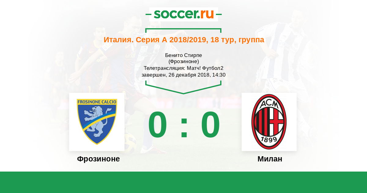 Доброго времени суток, уважаемые любители футбола! Рады приветствовать Вас на текстовой онлайн-трансляции матча восемнадцатого тура Серии А, в котором "Фрозиноне" сыграет с "Миланом". Встреча пройдет в Фрозиноне на стадионе "Бенито Стирпе". Обслужит матч бригада арбитров, которую возглавит Марко Гуида.