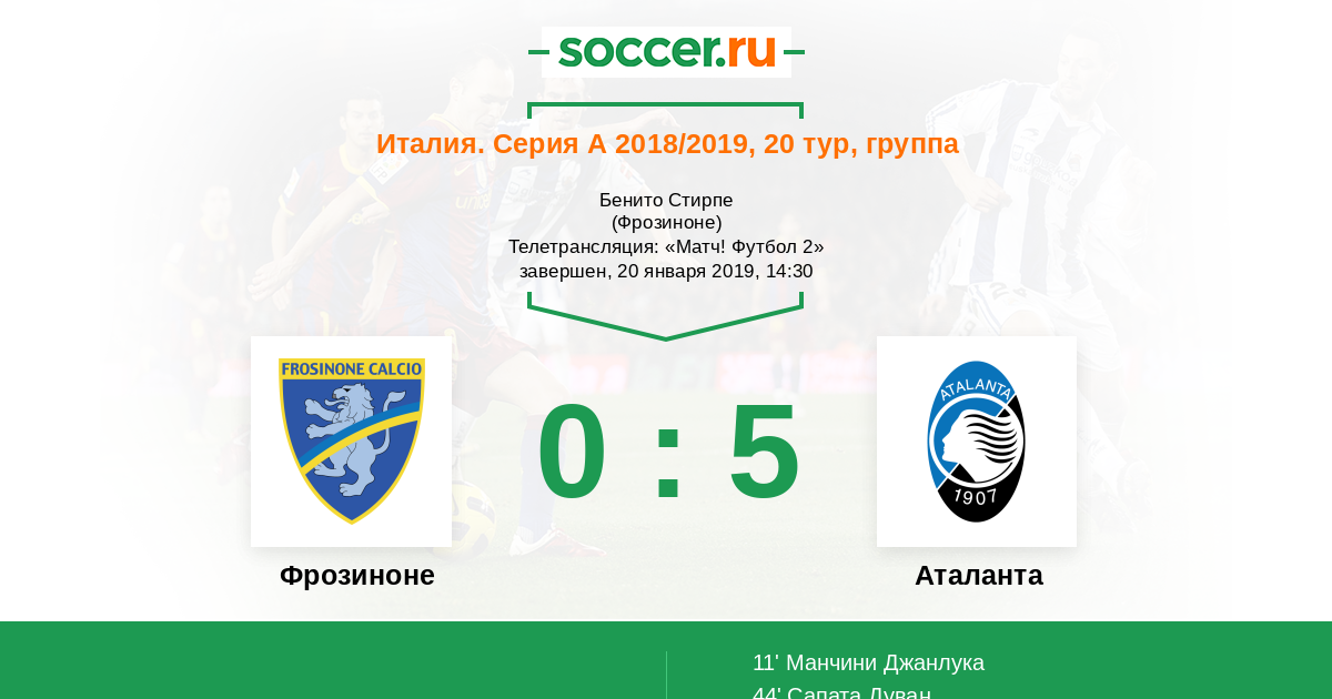Добрый день всем любителям футбола! Рады приветствовать Вас на матче 20-го тура итальянской Серии А, в котором на стадионе "Бенито Стирпе" сыграют "Аталанта" и "Фрозиноне".
