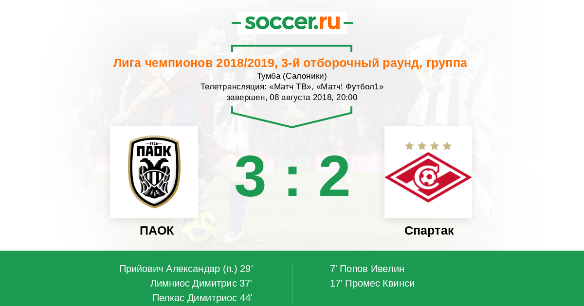 Доброго времени суток, уважаемые любители футбола! Рады приветствовать Вас на текстовой онлайн-трансляции матча третьего отборочного раунда Лиги чемпионов, в котором "Спартак" будет противостоять греческому ПАОКу. Встреча пройдет в Салониках на стадионе "Тумба". Обслужит матч бригада арбитров во главе с Орелем Гринфельдом.