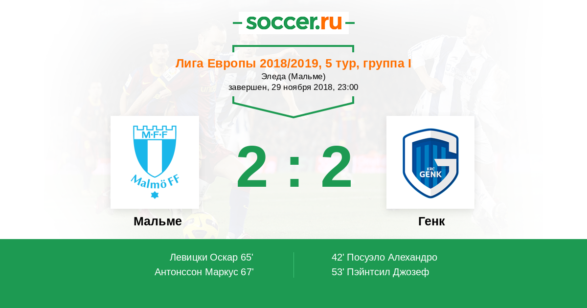Алехандро Посуэло (Генк) принял пас и пробил наудачу из средней зоны в левый нижний угол, но Йохан Далин был спокоен и сделал сэйв.
