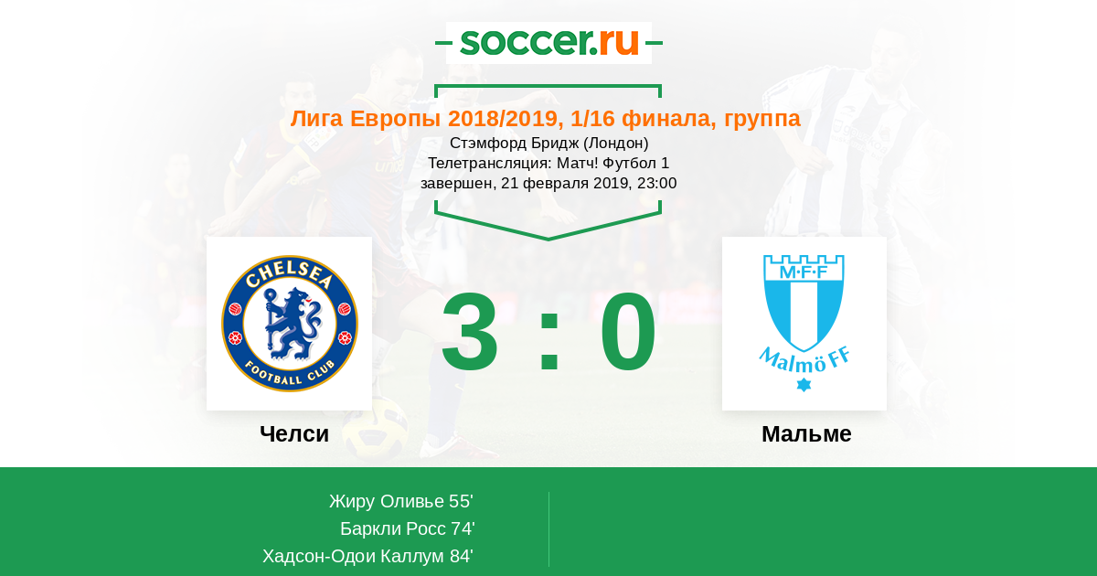 Аккуратный навес с фланга в штрафную площадку в район одиннадцатиметровой отметки. Там Оливье Жиру (Челси) наносит удар головой. Чуть выше перекладины! Мяч покинул пределы поля. Мальмё введет мяч в игру ударом от ворот.