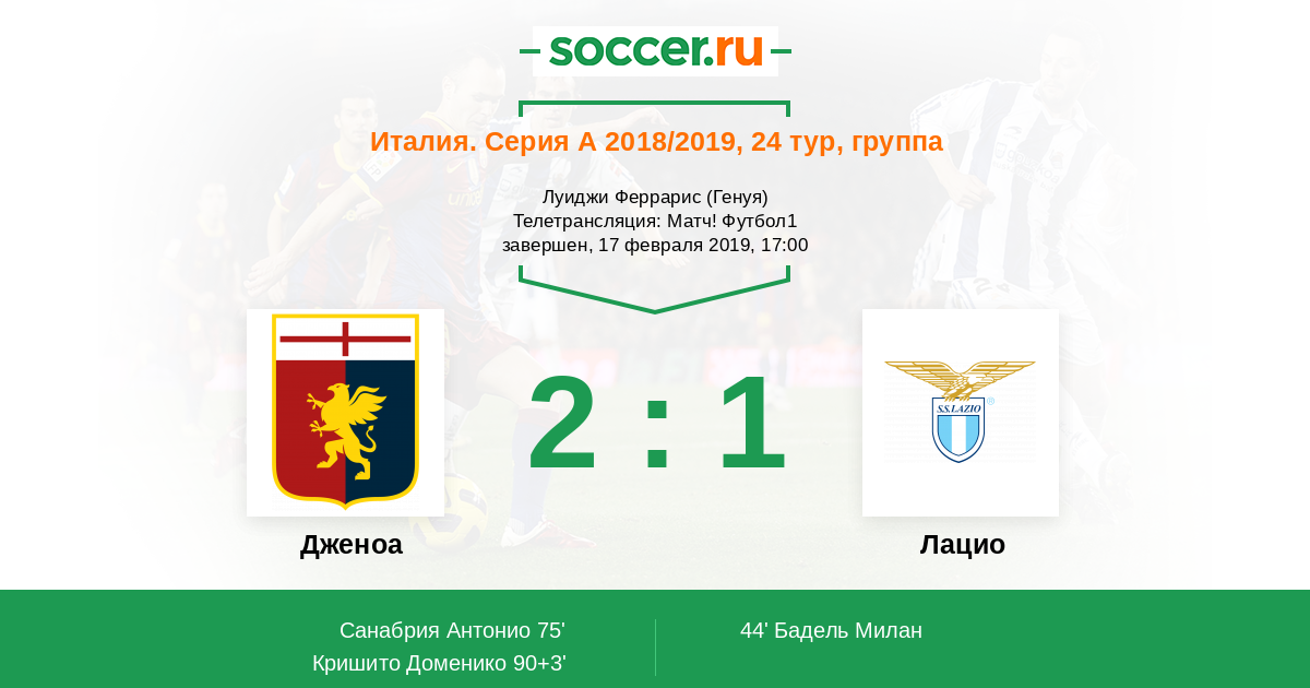 Доброго времени суток, уважаемые любители футбола! Рады приветствовать Вас на текстовой онлайн-трансляции матча Серии А, в котором "Дженоа" сыграет с "Лацио". Встреча пройдет в Генуе на стадионе "Луиджи Феррарис". Обслужит матч бригада арбитров во главе с Лукой Банти.