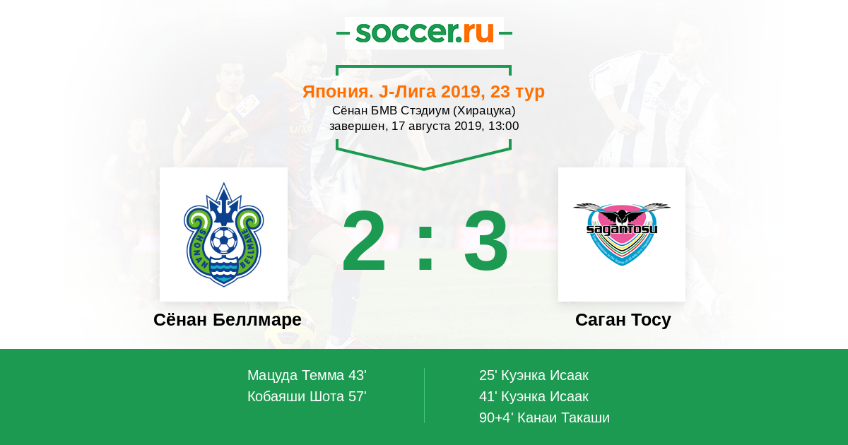 Сёнан Беллмаре - Саган Тосу: обзор матча 17 августа 2019