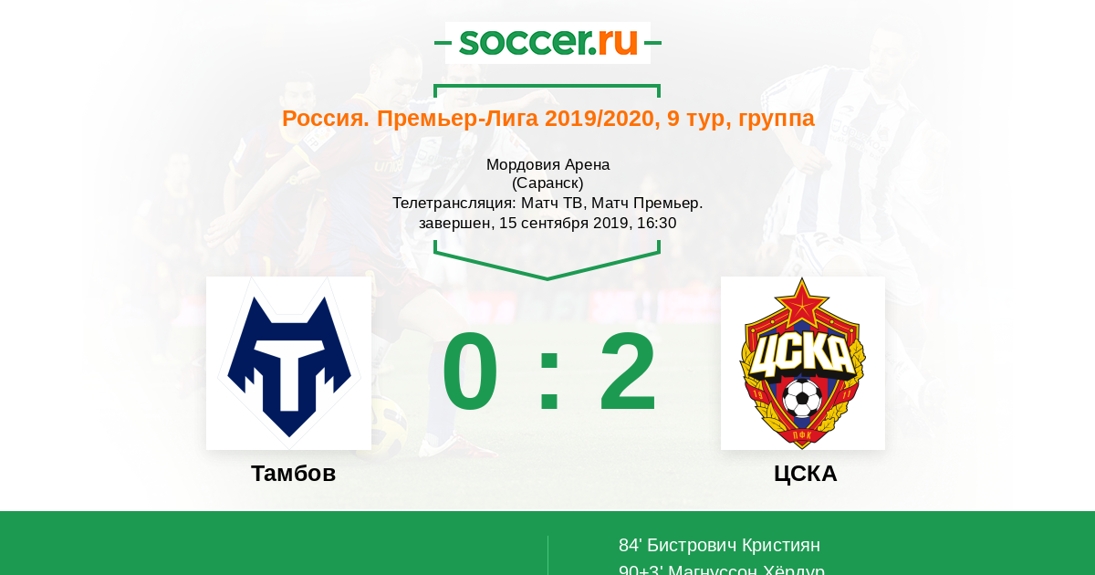Добрый день, уважаемые болельщики футбола! Сегодня в 9-м туре РПЛ "Тамбов" постарается взять очки у московского ЦСКА. Уровень соперников несопоставим. Хозяева поля по подбору исполнителей вряд ли могут сравниться с претендентом на высокое место. Гости, набравшие неплохие обороты, будут стремиться только к максимальному результату. "Тамбов" не побеждает в пяти матчах кряду, способен ли ЦСКА нанести хозяевам очередное поражение? Сайт https://www.soccer.ru проведёт прямую текстовую онлайн трансляцию матча, следить за событиями на поле и комментировать игру для вас будет Старчеус Сергей.