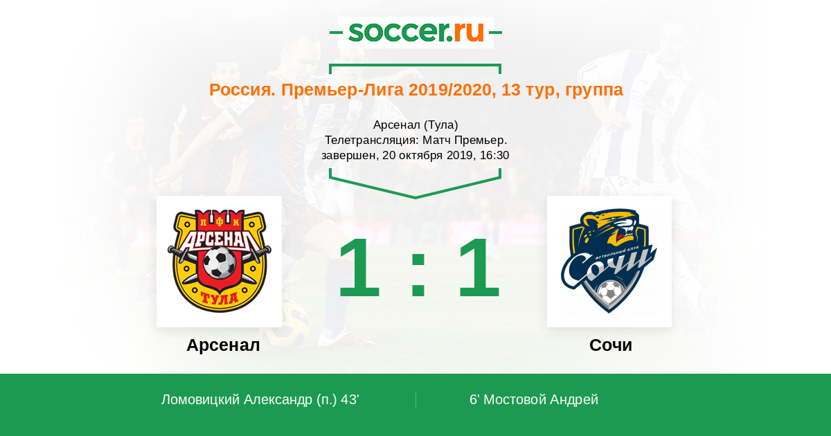Добрый день, уважаемые поклонники российской Премьер-лиги! "Арсенал" постарается на своём поле вырваться из обоймы команд, на счету которых по 14 очков, а гости не упустить шанс одним махом перескочить через целую группу соперников. "Арсенал" не брал очков в двух последних матчах, но исправятся ли "канониры" в игре с "Сочи"? Сайт https://www.soccer.ru проведёт прямую текстовую онлайн трансляцию матча, следить за событиями на поле и комментировать игру для вас будет Старчеус Сергей.