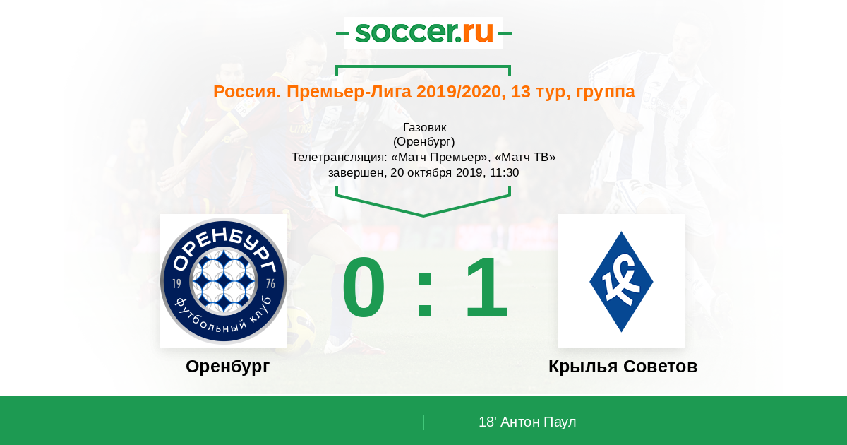 ⚽ - Оренбург - Крылья Советов (Самара) 🥅 - Стадион "Газовик" ⏰- 20 октября. Начало матча в 13.30 (11.30 МСК) 📺- Трансляция на телеканале «МатчТВ» 🎫- Билеты https://t.co/CFzSWit9g8pic.twitter.com/5BJk4NHRvw